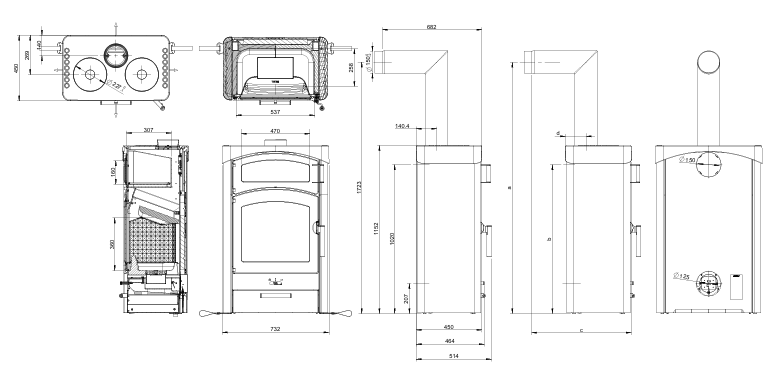 - Kaminofen mit integrierten Kochplatten und großem Backfach