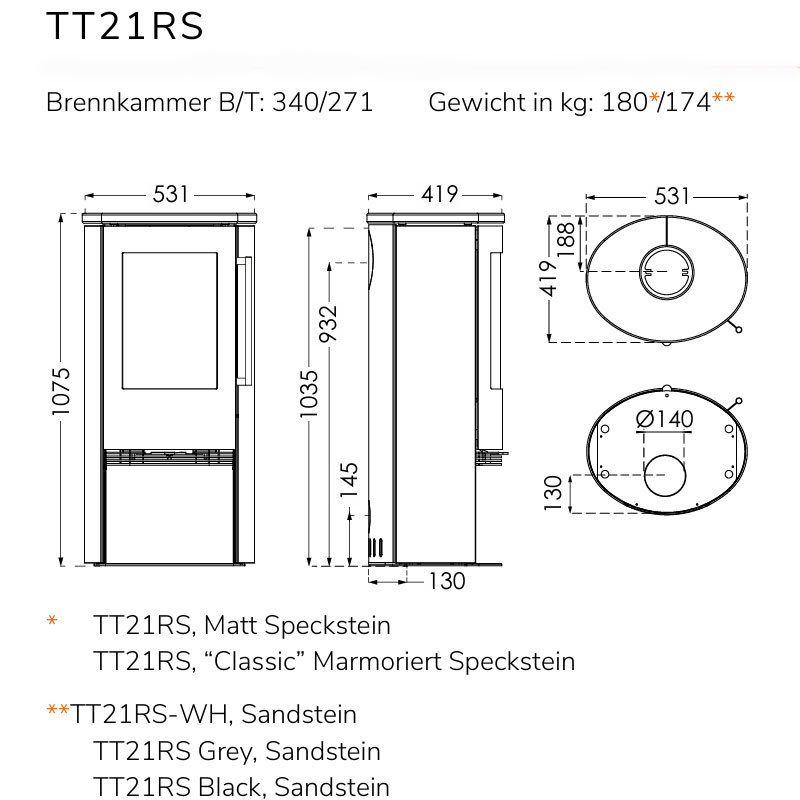 Der TermaTech TT21RS-Grey kombiniert einen schlanken Kaminofenkörper mit wärmespeicherndem Sandstein in elegantem Grau. Mit 5,0 kW Nennleistung beheizt er Wohnbereiche von 30–120 m² und sorgt dabei für eine gleichmäßige, angenehme Wärmeabgabe.