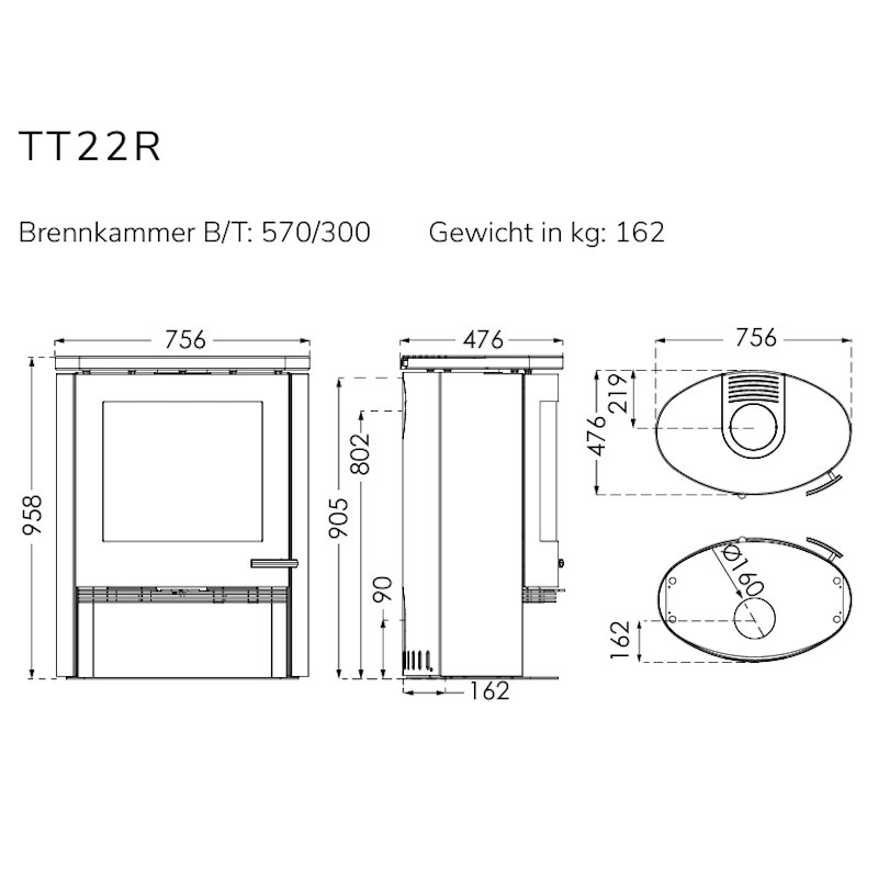 Der TermaTech TT22R liefert 7,5 kW Nennleistung und erwärmt Wohnbereiche von 40–160 m². Die abgerundeten Seiten und die Guss-Topplatte verbinden klare Optik mit robuster Alltagstauglichkeit.