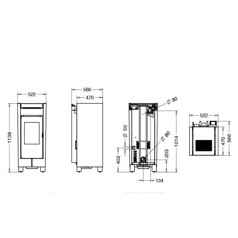 • Abgas: Ø 80 mm, oben zentral oder mittig hinten