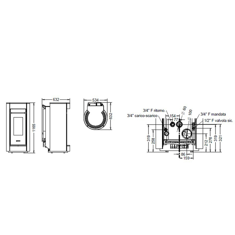 • Rauchrohr: Ø 100 mm, Anschluss oben/hinten