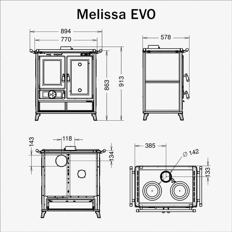Der Thermorossi Melissa EVO Stone ist ein kompakter Holz- Küchenofen mit 8,2 kW Nennleistung für bis zu 74 m². Zwei separate Backfächer und die Gusskochplatte machen ihn zum vollwertigen Kochplatz – auch ohne Strom.